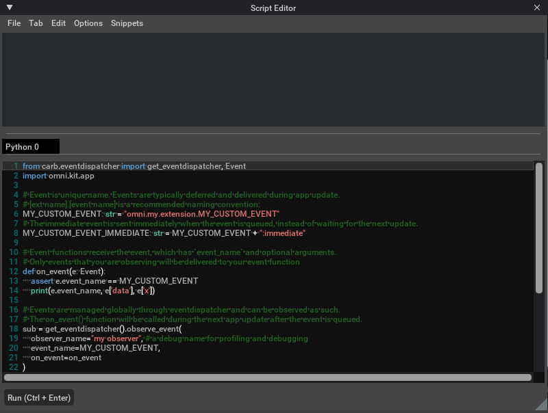 The Script Editor is an extension that lets you manually execute an entire file or multi-line block of Python code. It is similar to a command-line environment and can import and leverage much of the Kit API and USD schemas. This makes it a great way to perform simple tasks or tests without creating an extension.