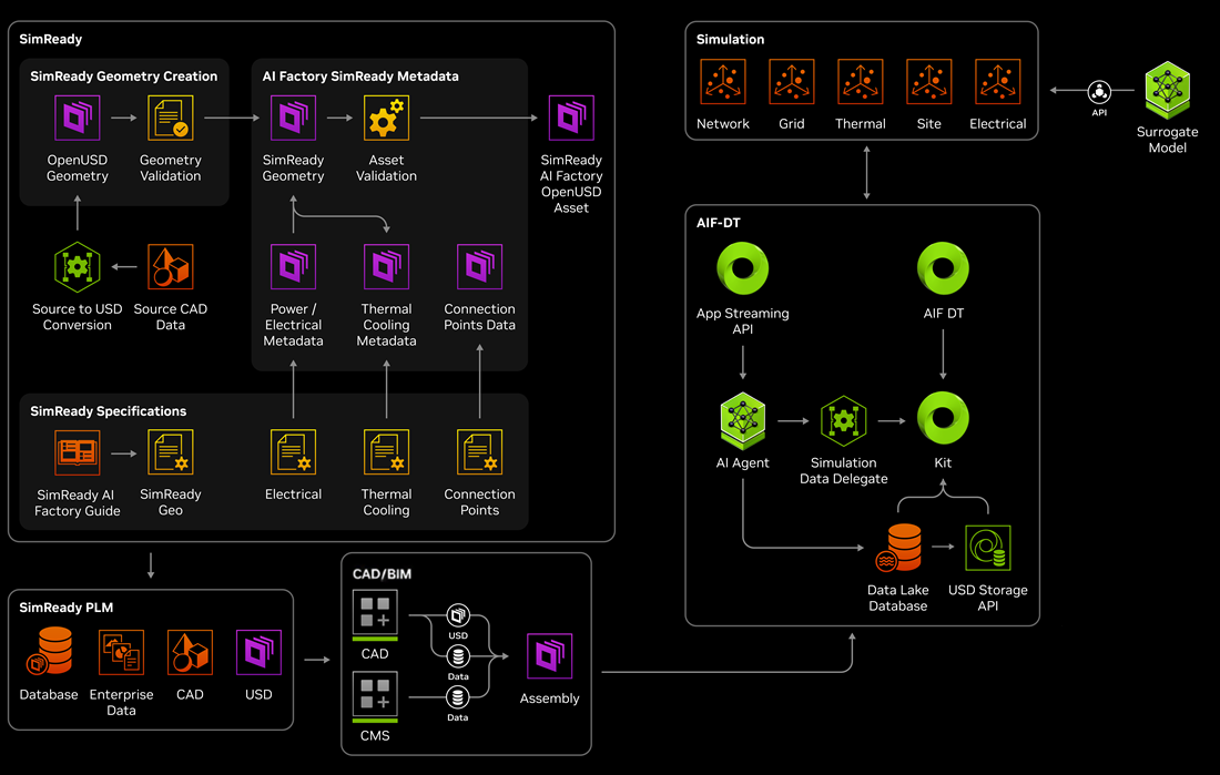 The overall flow allows SimReady assets, PLM assemblies, simulations, and surrogate models to stay aligned, giving stakeholders a coherent, up-to-date digital twin of the AI Factory that supports design, deployment, and operations.