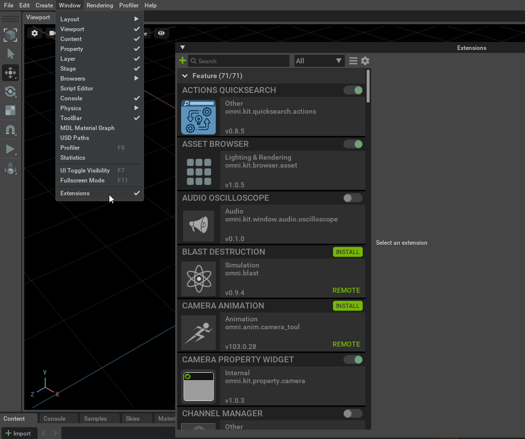• app\kit\omni.app.mini.bat to run another Kit based app. More developer oriented, minimalistic and fast to start.