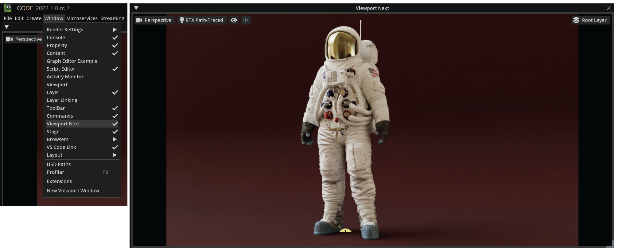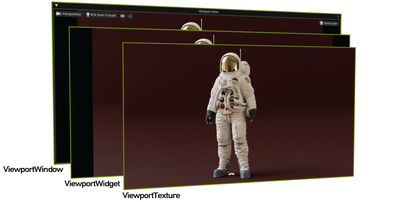 At a very high level a Viewport is a way for a user to visualize (and often interact with) a Renderer’s output of a scene. When you create a “Viewport Next” instance via Kit’s Window menu, you are actually creating a hierarchy of objects.