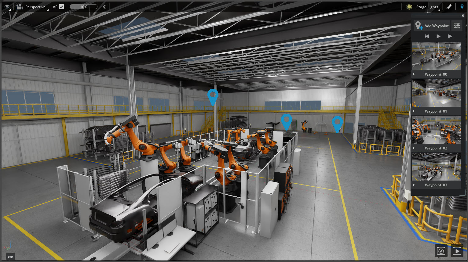 The Waypoint Extension allows you to create location markers called Waypoints. These markers represent a camera view and you can create/save them in your USD Stage. You can use Waypoints at any time to easily navigate back to a particular camera view. This Extension is enabled by default in most Omniverse Apps, like USD Explorer and USD Composer.