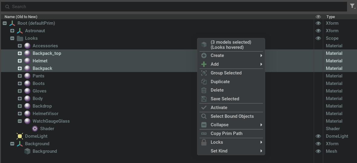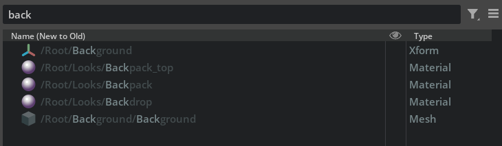 In the search field, users can type in filter text for prim paths to search for prims with matching keywords. Matched pattern will be higtlighted. When “Flat List Search” is enabled in the options menu, search results will be displayed as a flat list regardless of the prim hierarchy. Otherwise search results will maintain their prim hierarchy.