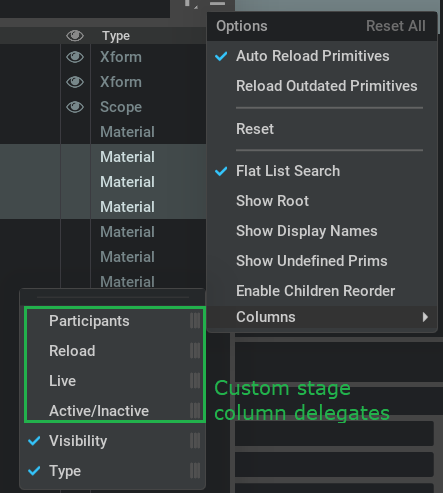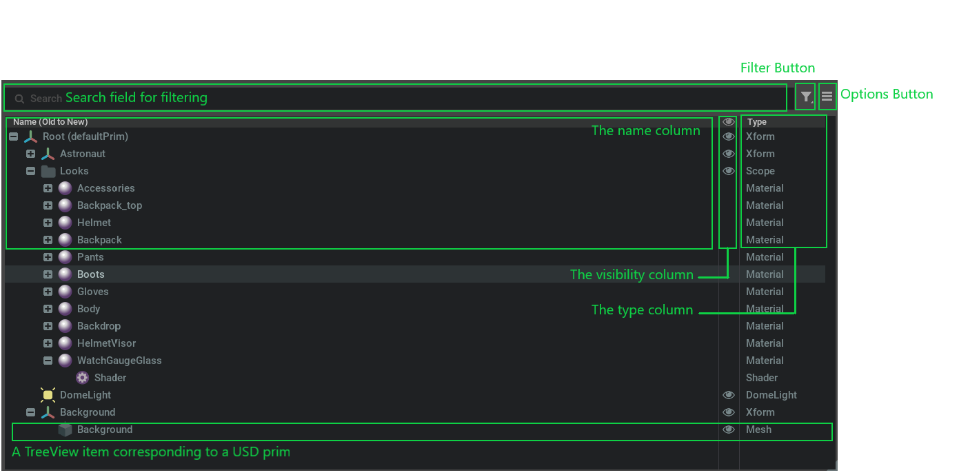displays the current stage prim hierarchy, with three columns, namely the prim name, type and visibility column. It also