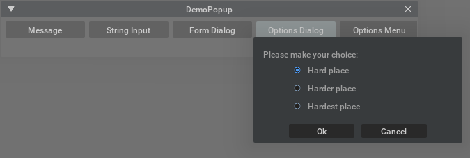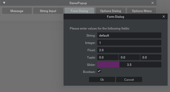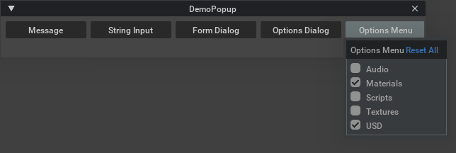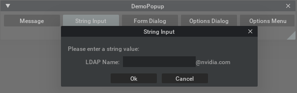 A complete demo, that includes the code snippets above, is included with this extension at “scripts/demo_popup_dialog.py”.