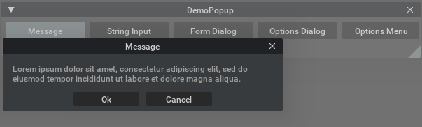A set of simple Popup Dialogs for passing user inputs. All of these dialogs subclass from the base PopupDialog, which provides OK and Cancel buttons. The user is able to re-label these buttons as well as associate callbacks that execute upon being clicked.