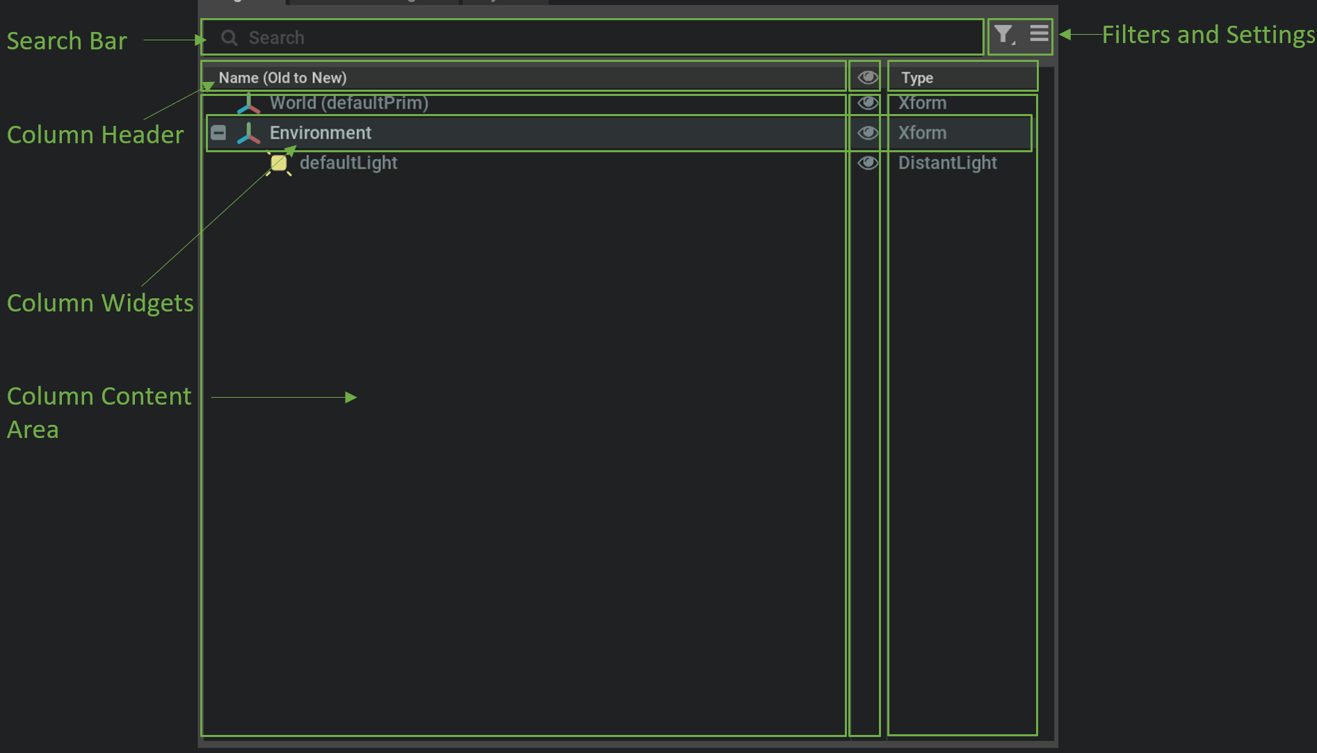For each prim in the stage, it’s presented as a row in the window with several columns, and the hierarchy of the stage is presented as a collapsible tree. The columns are customizable except the default name column through the settings button. Developers can