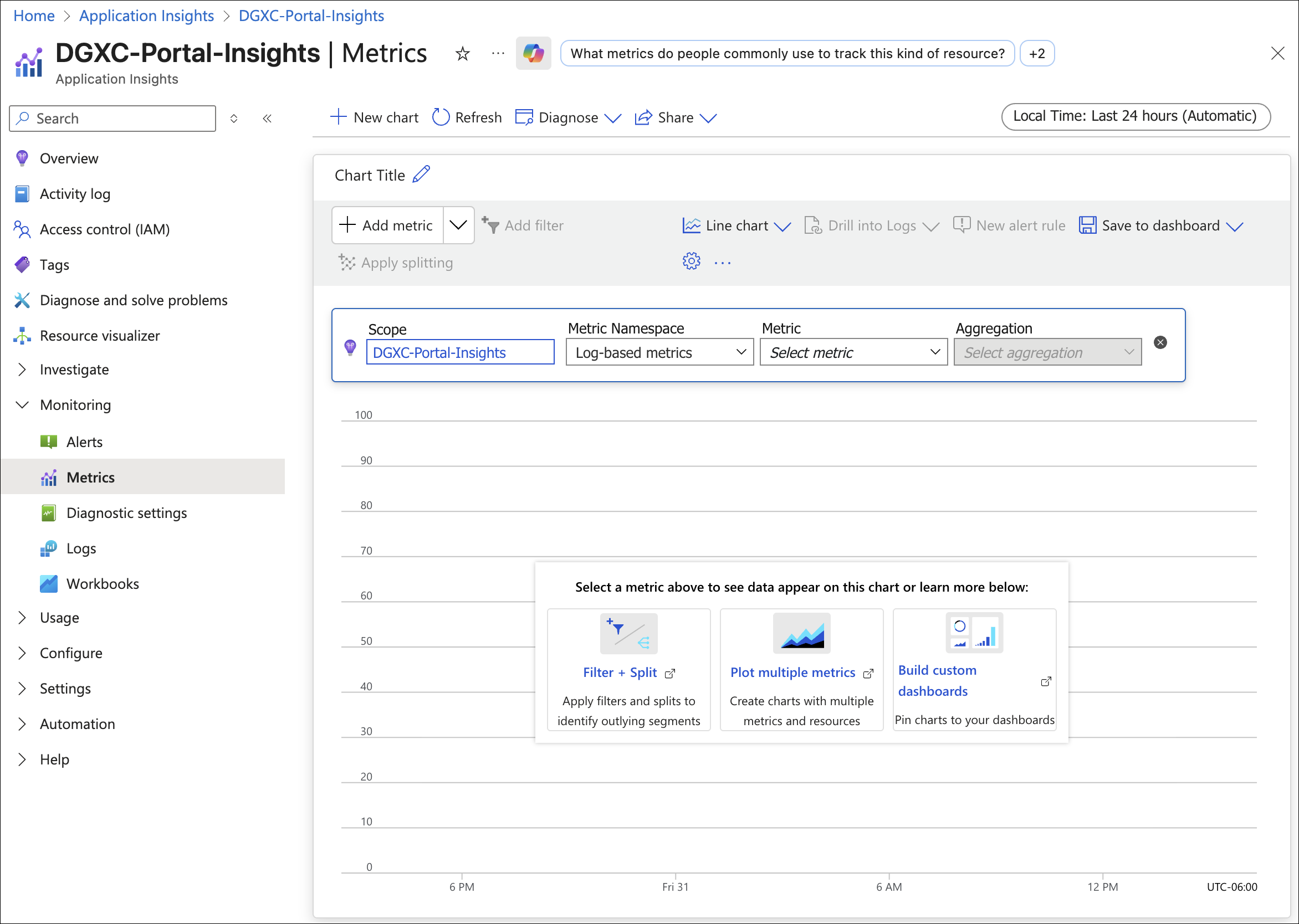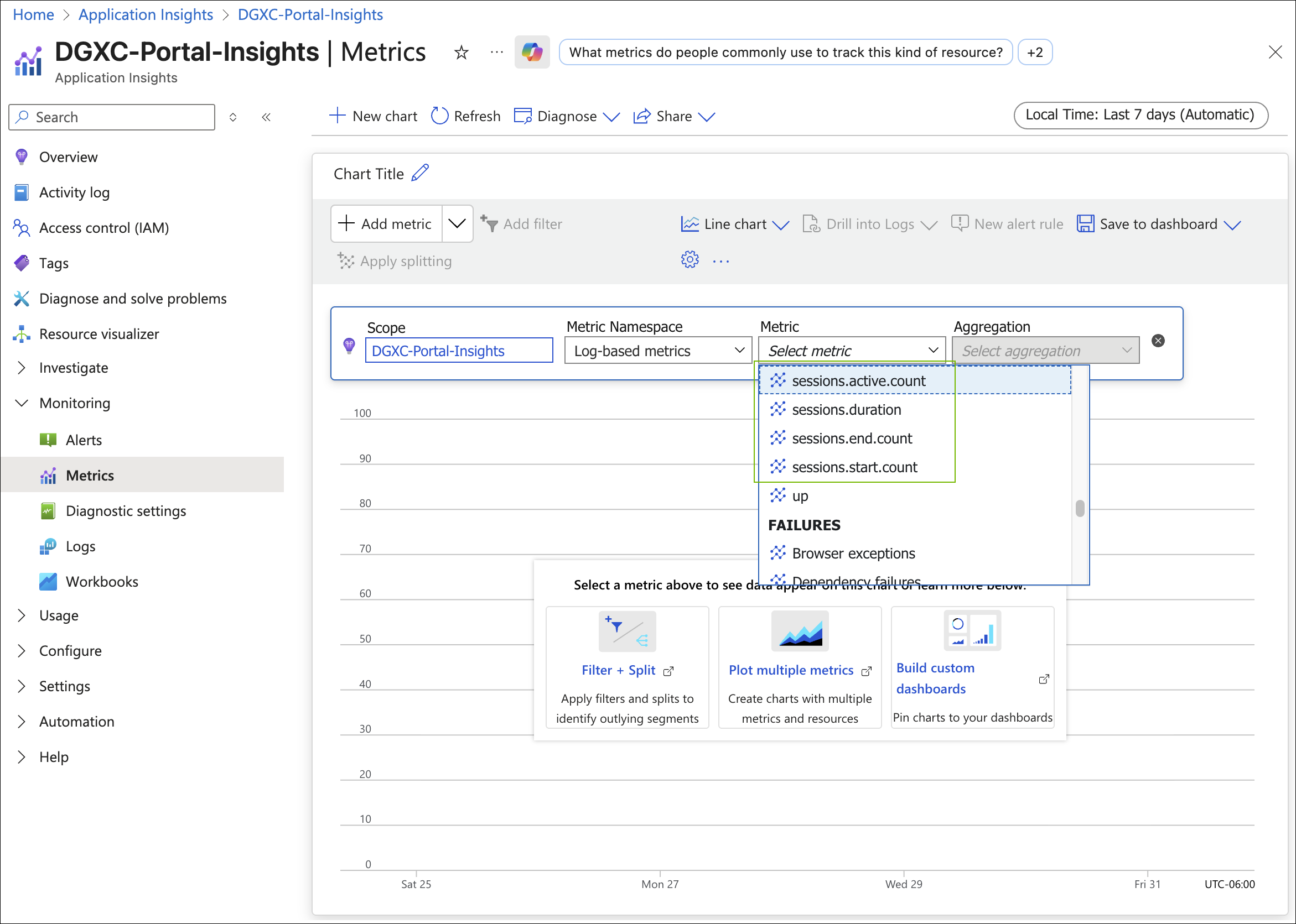 In the Azure Portal, browse to Application Insights for the resource receiving telemetry. Open Monitoring -> Metrics and verify that custom metrics appear in the metrics dropdown.