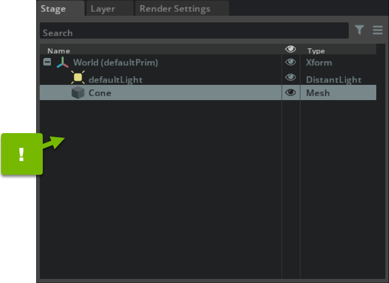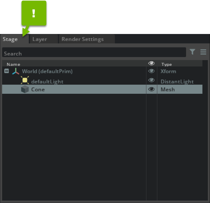The Omniverse Stage panel allows you to see all the assets in your current USD Scene. The Stage is the USD abstraction for a scenegraph derived from a root USD file, and all of the referenced/layered files it composes. Listed in a hierarchical (parent/child) order the Stage offers convenient access and is typically used to navigate large scenes.