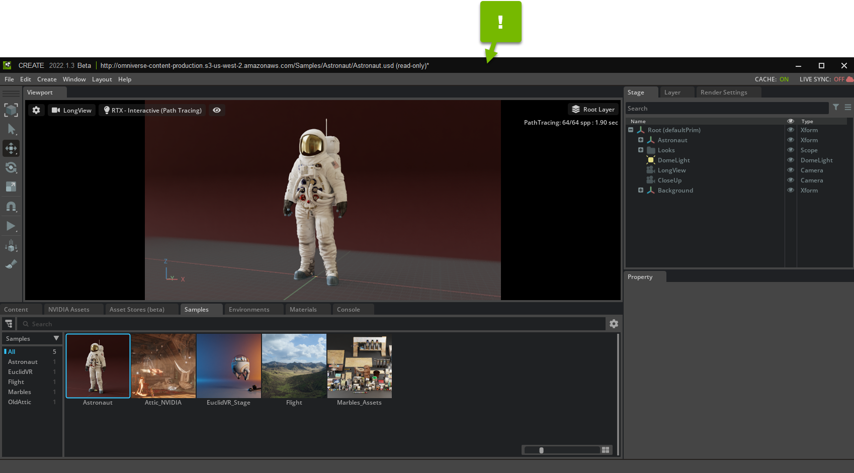 Live Sync mode enables real-time “live” editing of shared files on a Nucleus Server. The Live Sync button is on the top-right corner of the Workspace.